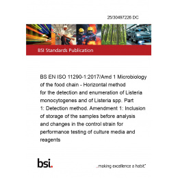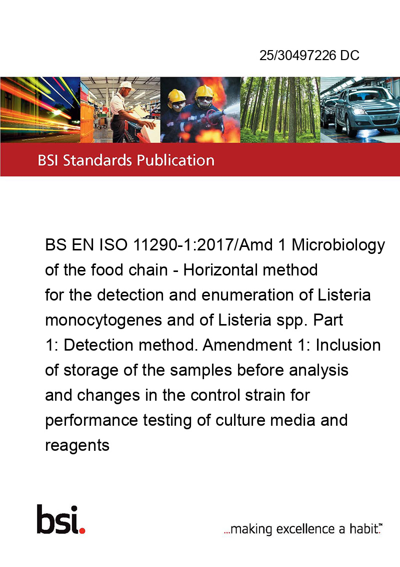 BS EN ISO 11290-1:2017/Amd 1 Microbiology of the food chain - Horizontal method for the detection and enumeration of Listeria monocytogenes and of Listeria spp. Part 1: Detection method. Amendment 1: Inclusion of storage of the samples before analysis and changes in the control strain for performance testing of culture media and reagents