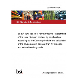 BS EN ISO 16634-1 Food products - Determination of the total nitrogen content by combustion according to the Dumas principle and calculation of the crude protein content Part 1: Oilseeds and animal feeding stuffs