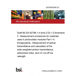 Draft BS EN 62788-1-4 Amd.2 Ed.1.0 Amendment 2 - Measurement procedures for materials used in photovoltaic modules Part 1-4: Encapsulants - Measurement of optical transmittance and calculation of the solar-weighted photon transmittance, yellowness index, and UV cut-off wavelength