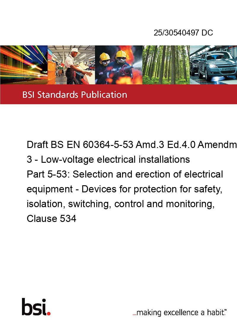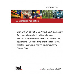 Draft BS EN 60364-5-53 Amd.3 Ed.4.0 Amendment 3 - Low-voltage electrical installations Part 5-53: Selection and erection of electrical equipment - Devices for protection for safety, isolation, switching, control and monitoring, Clause 534