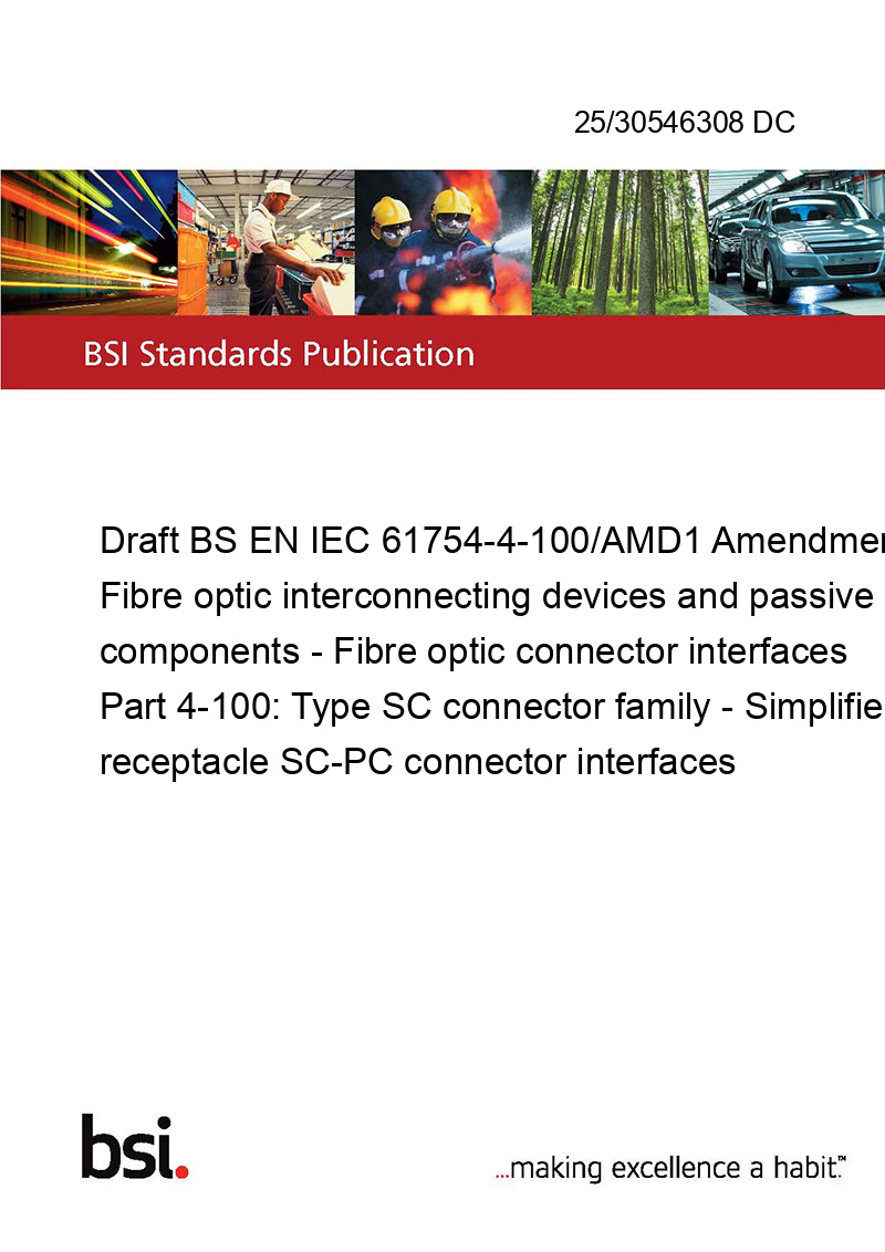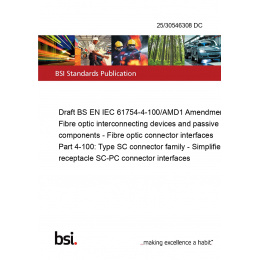 Draft BS EN IEC 61754-4-100/AMD1 Amendment 1 - Fibre optic interconnecting devices and passive components - Fibre optic connector interfaces Part 4-100: Type SC connector family - Simplified receptacle SC-PC connector interfaces