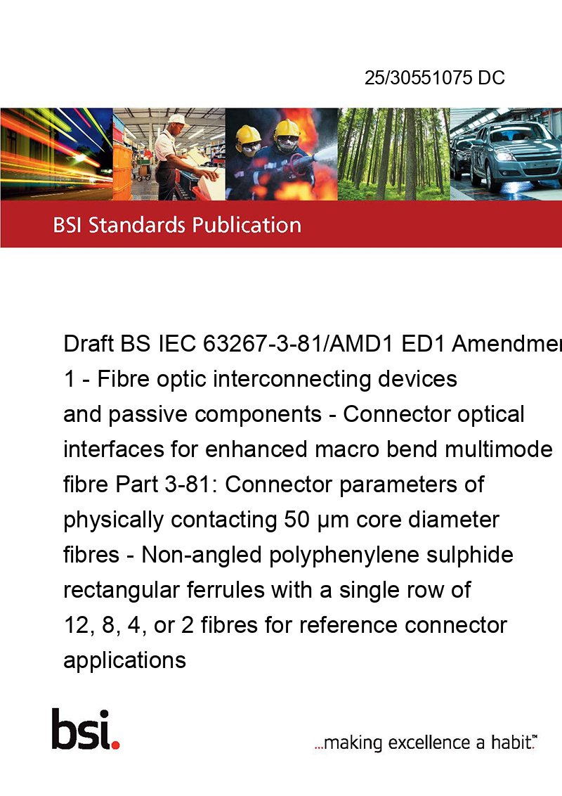 Draft BS IEC 63267-3-81/AMD1 ED1 Amendment 1 - Fibre optic interconnecting devices and passive components - Connector optical interfaces for enhanced macro bend multimode fibre Part 3-81: Connector parameters of physically contacting 50 μm core diameter fibres - Non-angled polyphenylene sulphide rectangular ferrules with a single row of 12, 8, 4, or 2 fibres for reference connector applications
