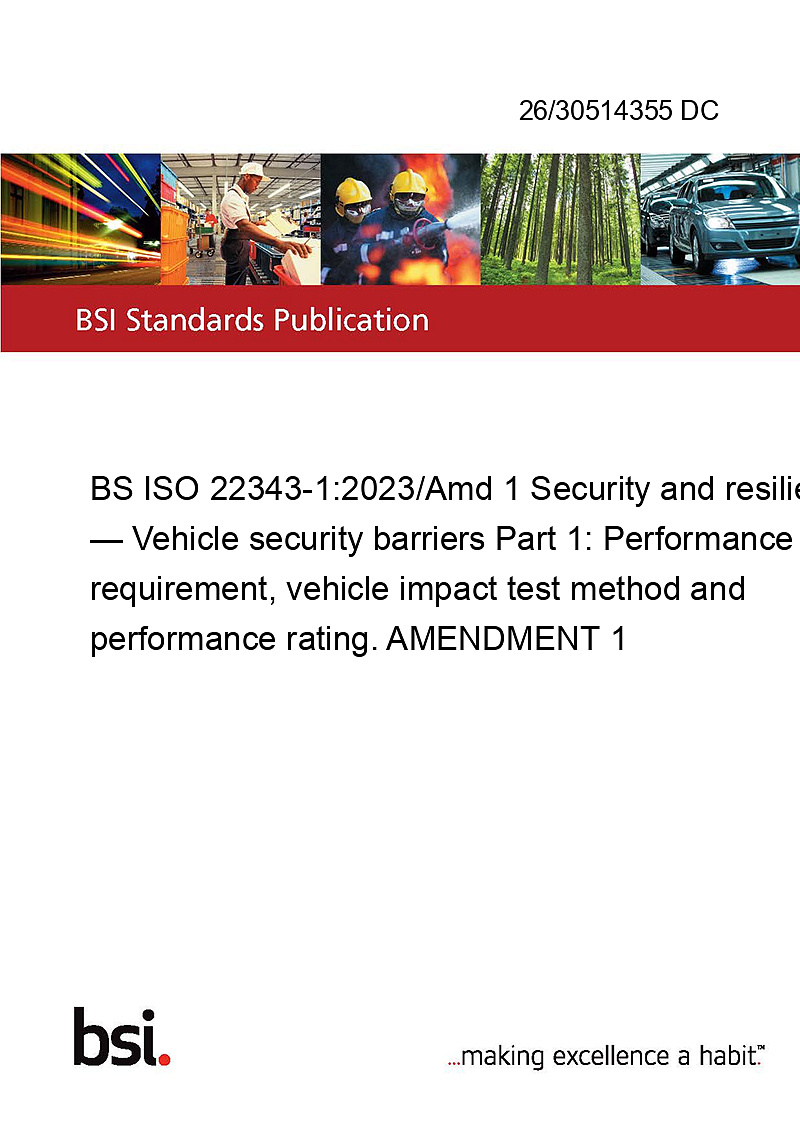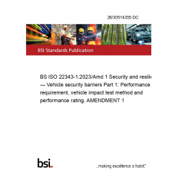 BS ISO 22343-1:2023/Amd 1 Security and resilience — Vehicle security barriers Part 1: Performance requirement, vehicle impact test method and performance rating. AMENDMENT 1