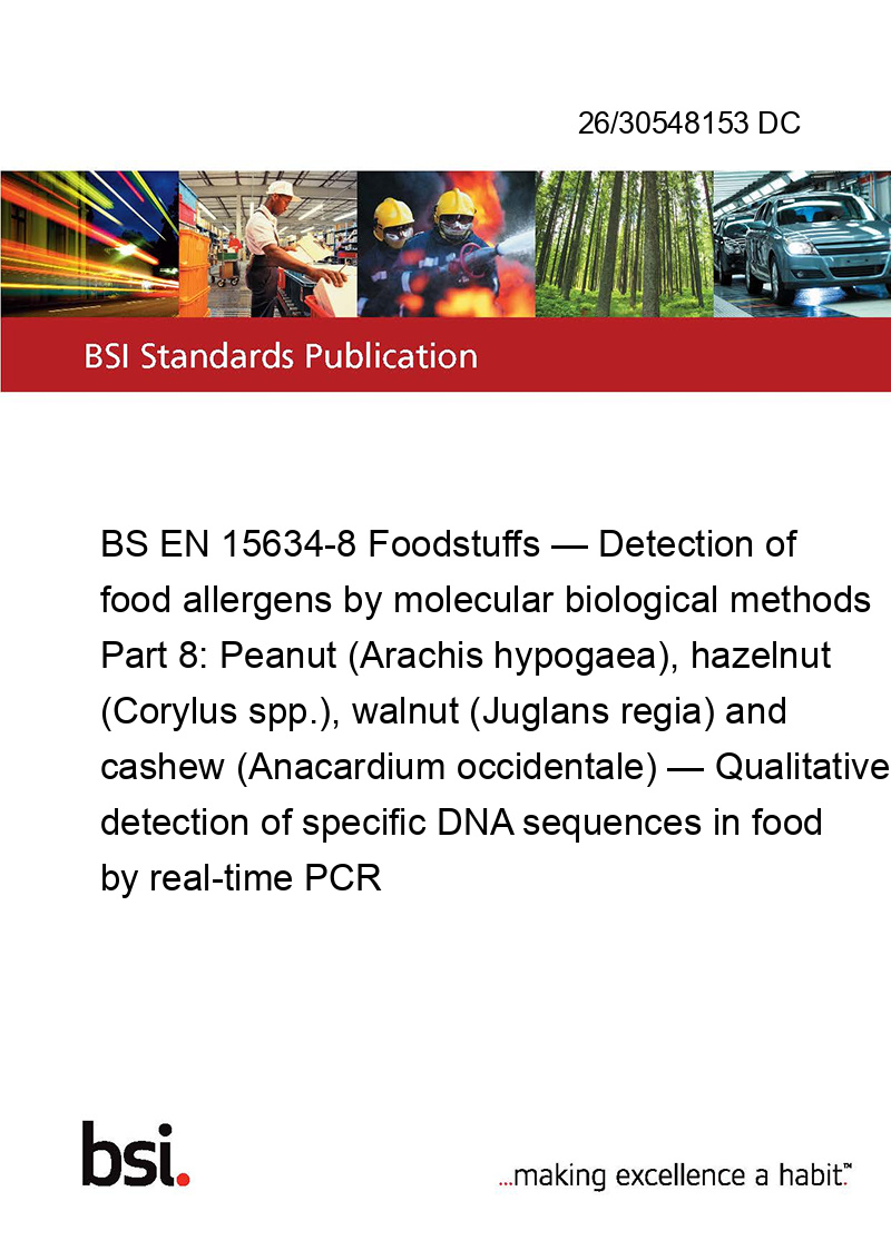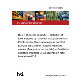 BS EN 15634-8 Foodstuffs — Detection of food allergens by molecular biological methods Part 8: Peanut (Arachis hypogaea), hazelnut (Corylus spp.), walnut (Juglans regia) and cashew (Anacardium occidentale) — Qualitative detection of specific DNA sequences in food by real-time PCR