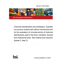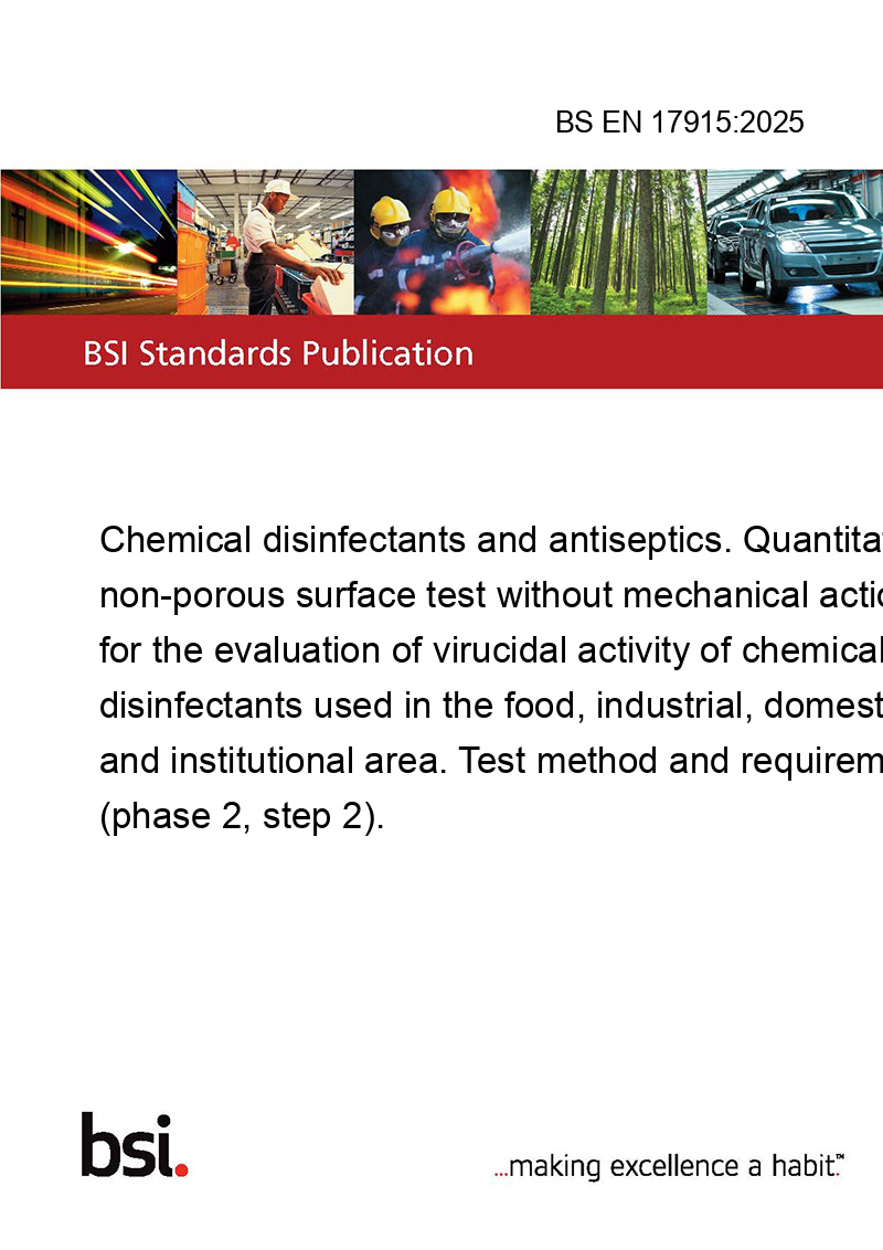 This standard BS EN 17915:2025 Chemical disinfectants and antiseptics. Quantitative non-porous surface test without mechanical action for the evaluation of virucidal activity of chemical disinfectants used in the food, industrial, domestic and institutional area. Test method and requirements (phase 2, step 2) is classified in these ICS categories: