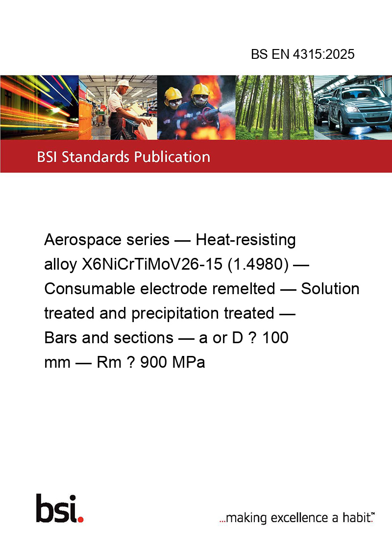 BS EN 4315:2025 Aerospace series — Heat-resisting alloy X6NiCrTiMoV26-15 (1.4980) — Consumable electrode remelted — Solution treated and precipitation treated — Bars and sections — a or D ? 100 mm — Rm ? 900 MPa