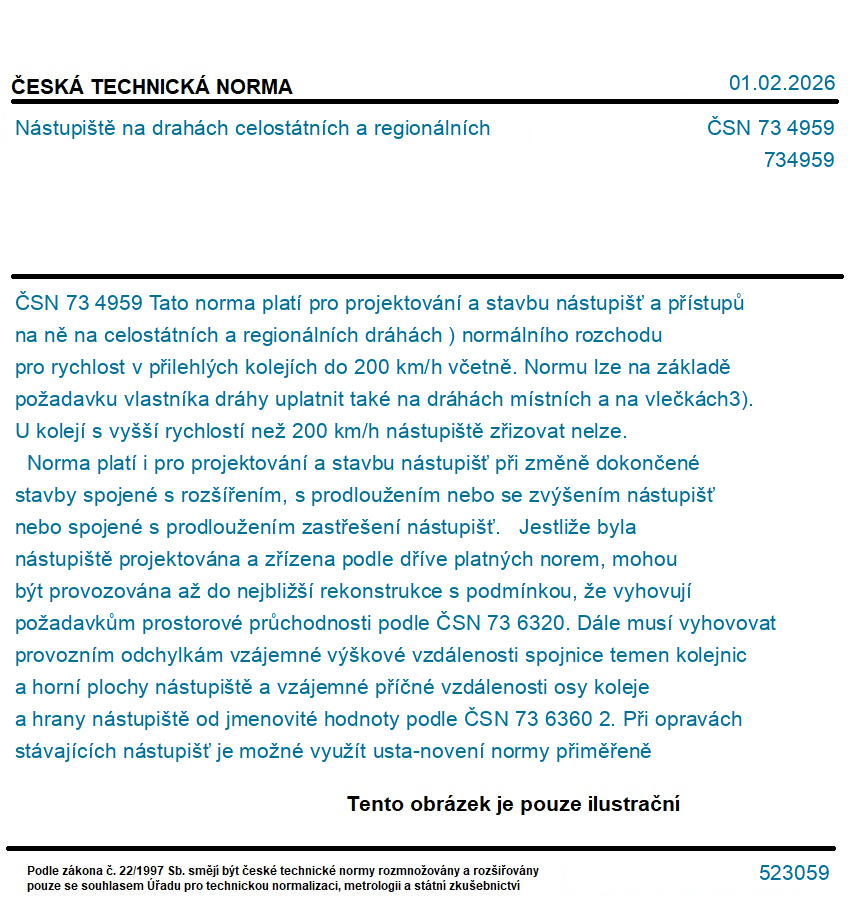 Tato norma platí pro projektování a stavbu nástupišť a přístupů na ně na celostátních a regionálních dráhách ) normálního rozchodu pro rychlost v přilehlých kolejích do 200 km/h včetně. Normu lze na základě požadavku vlastníka dráhy uplatnit také na dráhách místních a na vlečkách3). U kolejí s vyšší rychlostí než 200 km/h nástupiště zřizovat nelze. Norma platí i pro projektování a stavbu nástupišť při změně dokončené stavby spojené s rozšířením, s prodloužením nebo se zvýšením nástupišť nebo spojené s prodloužením zastřešení nástupišť. Jestliže byla nástupiště projektována a zřízena podle dříve platných norem, mohou být provozována až do nejbližší rekonstrukce s podmínkou, že vyhovují požadavkům prostorové průchodnosti podle ČSN 73 6320. Dále musí vyhovovat provozním odchylkám vzájemné výškové vzdálenosti spojnice temen kolejnic a horní plochy nástupiště a vzájemné příčné vzdálenosti osy koleje a hrany nástupiště od jmenovité hodnoty podle ČSN 73 6360 2. Při opravách stávajících nástupišť je možné využít usta-novení normy přiměřeně místním podmínkám, současně nesmí nově vzniknout stavy nevyhovující této normě. U objektů, které jsou kulturní památkou, platí ustanovení této normy přiměřeně s ohledem na zájmy státní památkové péče.