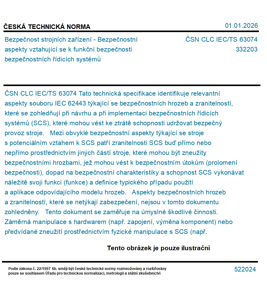 Tato technická specifikace identifikuje relevantní aspekty souboru IEC 62443 týkající se bezpečnostních hrozeb a zranitelností, které se zohledňují při návrhu a při implementaci bezpečnostních řídicích systémů (SCS), které mohou vést ke ztrátě schopnosti udržovat bezpečný provoz stroje. Mezi obvyklé bezpečnostní aspekty týkající se stroje s potenciálním vztahem k SCS patří zranitelnosti SCS buď přímo nebo nepřímo prostřednictvím jiných částí stroje, které mohou být zneužity bezpečnostními hrozbami, jež mohou vést k bezpečnostním útokům (prolomení bezpečnosti), dopad na bezpečnostní charakteristiky a schopnost SCS vykonávat náležitě svoji funkci (funkce) a definice typického případu použití a aplikace odpovídajícího modelu hrozeb. Aspekty bezpečnostních hrozeb a zranitelností, které se netýkají zabezpečení, nejsou v tomto dokumentu zohledněny. Tento dokument se zaměřuje na úmyslné škodlivé činnosti. Záměrná manipulace s hardwarem (např. zapojení, výměna komponent) nebo předvídané zneužití prostřednictvím fyzické manipulace s SCS (např. fyzický bypass) nejsou v tomto dokumentu zohledněny. Tento dokument nezahrnuje bezpečnostní požadavky na produkty informační technologie (IT) a na návrh zařízení používaných v SCS (např. mohou být k dispozici normy specifické pro produkty, jako je IEC/TS 63208).