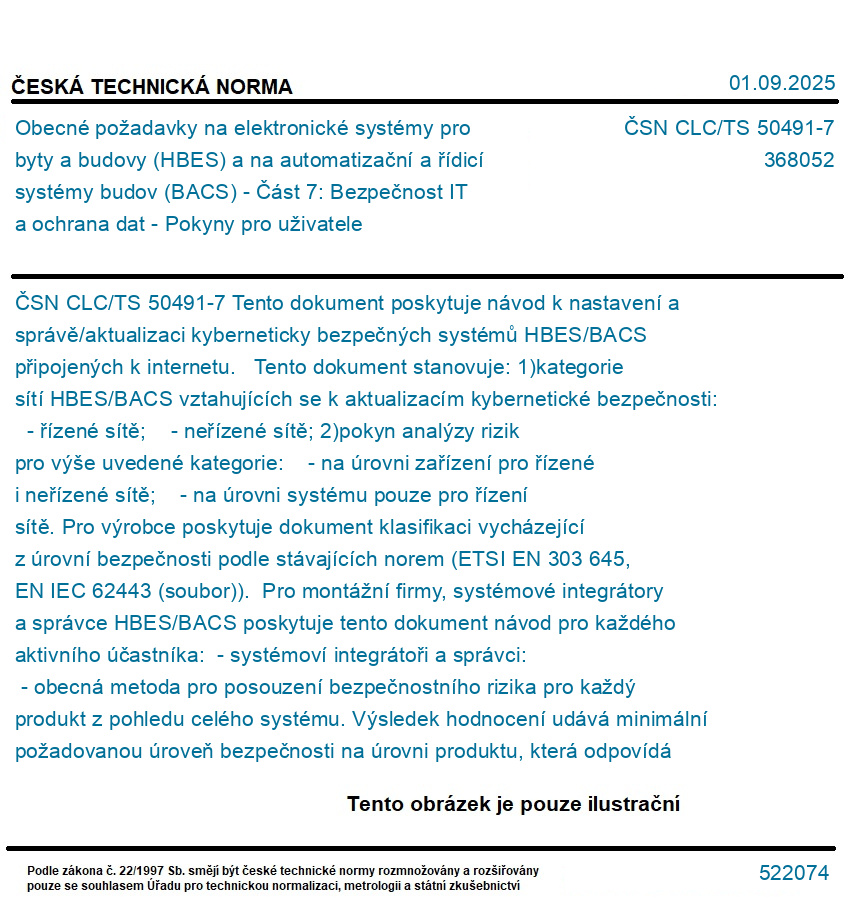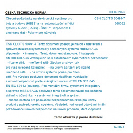 Tento dokument poskytuje návod k nastavení a správě/aktualizaci kyberneticky bezpečných systémů HBES/BACS připojených k internetu. Tento dokument stanovuje: 1)kategorie sítí HBES/BACS vztahujících se k aktualizacím kybernetické bezpečnosti: - řízené sítě; - neřízené sítě; 2)pokyn analýzy rizik pro výše uvedené kategorie: - na úrovni zařízení pro řízené i neřízené sítě; - na úrovni systému pouze pro řízení sítě. Pro výrobce poskytuje dokument klasifikaci vycházející z úrovní bezpečnosti podle stávajících norem (ETSI EN 303 645, EN IEC 62443 (soubor)). Pro montážní firmy, systémové integrátory a správce HBES/BACS poskytuje tento dokument návod pro každého aktivního účastníka: - systémoví integrátoři a správci: - obecná metoda pro posouzení bezpečnostního rizika pro každý produkt z pohledu celého systému. Výsledek hodnocení udává minimální požadovanou úroveň bezpečnosti na úrovni produktu, která odpovídá klasifikaci výrobce; - opatření na základě osvědčených postupů na úrovni bezpečnosti systému; - pokyn pro zvýšení úrovně zralosti procesu managementu kybernetické bezpečnosti. - montážní firmy, systémoví integrátoři a správci: - pokyn pro výběr produktů, které splňují požadovanou úroveň bezpečnosti během konfigurace a provozu. V některých komerčních aplikacích mohou pro každou zemi platit zvláštní normy, na které se tento dokument nevztahuje, např.: - požár (např. detekce, výstraha); - lékařství; - bezpečnostní aplikace: výstražné systémy proti vloupání, videodohled, řízení přístupu; - kritická infrastruktura; - AAL (aktivní asistované bydlení). Pro takové aplikace, na které se tento dokument nevztahuje, se specifikace může použít jako návod.