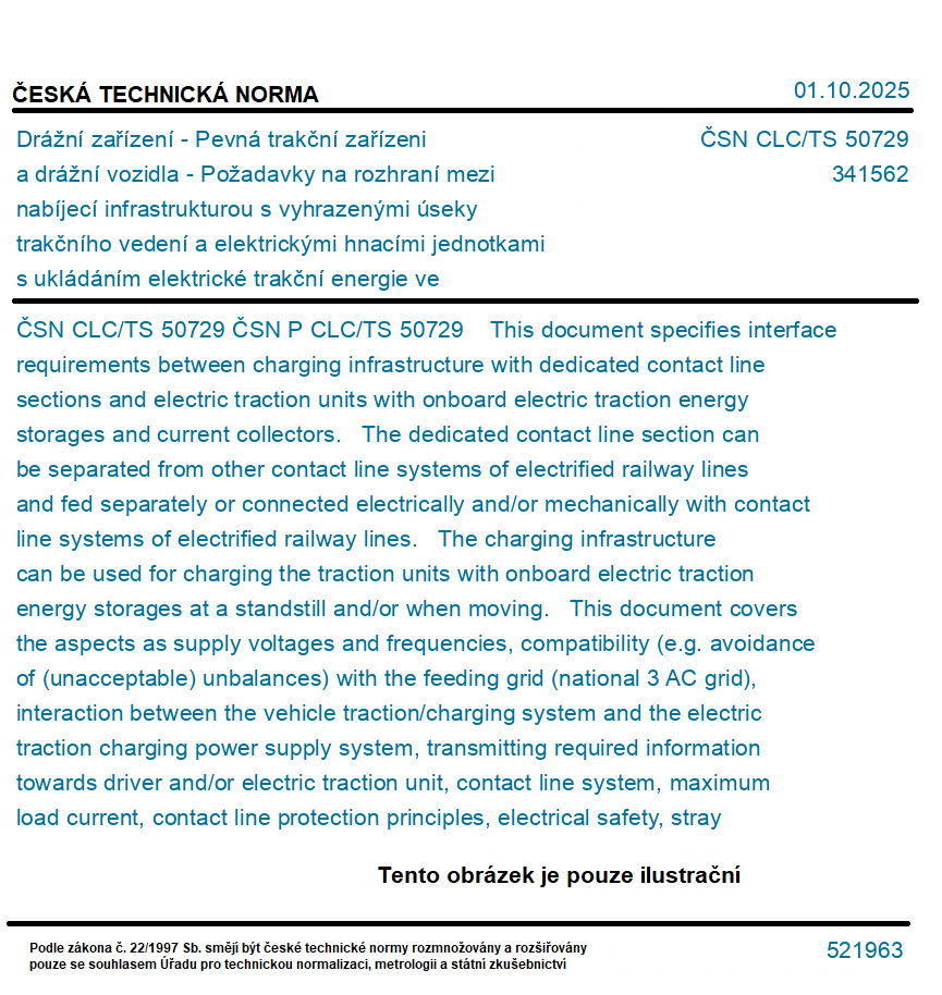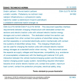 ČSN P CLC/TS 50729 This document specifies interface requirements between charging infrastructure with dedicated contact line sections and electric traction units with onboard electric traction energy storages and current collectors. The dedicated contact line section can be separated from other contact line systems of electrified railway lines and fed separately or connected electrically and/or mechanically with contact line systems of electrified railway lines. The charging infrastructure can be used for charging the traction units with onboard electric traction energy storages at a standstill and/or when moving. This document covers the aspects as supply voltages and frequencies, compatibility (e.g. avoidance of (unacceptable) unbalances) with the feeding grid (national 3 AC grid), interaction between the vehicle traction/charging system and the electric traction charging power supply system, transmitting required information towards driver and/or electric traction unit, contact line system, maximum load current, contact line protection principles, electrical safety, stray current protection (in case of DC electric traction power supply systems), protection against influence on signalling systems and energy measurement and settlement. This document applies to new charging infrastructure and/or new electric traction units with onboard electric traction energy storage. Although this document is primarily applicable to railways it can also be partially applied to guided mass transport systems such as tramways, and elevated and underground railways. This document does not apply to charging with a plug or connector solution or inverted current collectors mounted on the infrastructure side. This document does not apply to electric road systems with overhead contact line systems.