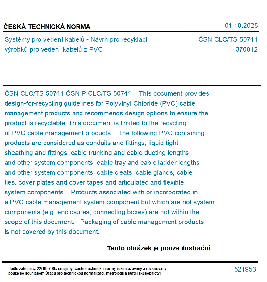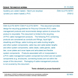 ČSN P CLC/TS 50741 This document provides design-for-recycling guidelines for Polyvinyl Chloride (PVC) cable management products and recommends design options to ensure the product is recyclable. This document is limited to the recycling of PVC cable management products. The following PVC containing products are considered as conduits and fittings, liquid tight sheathing and fittings, cable trunking and cable ducting lengths and other system components, cable tray and cable ladder lengths and other system components, cable cleats, cable glands, cable ties, cover plates and cover tapes and articulated and flexible system components. Products associated with or incorporated in a PVC cable management system component but which are not system components (e.g. enclosures, connecting boxes) are not within the scope of this document. Packaging of cable management products is not covered by this document.