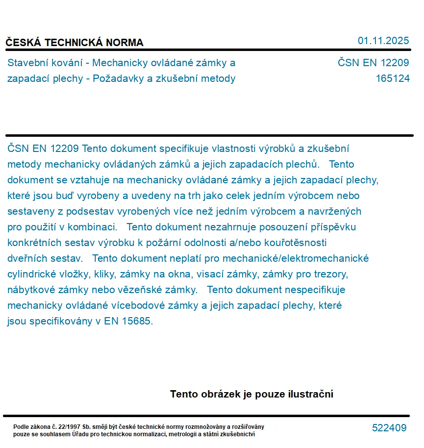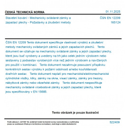 Tento dokument specifikuje vlastnosti výrobků a zkušební metody mechanicky ovládaných zámků a jejich zapadacích plechů. Tento dokument se vztahuje na mechanicky ovládané zámky a jejich zapadací plechy, které jsou buď vyrobeny a uvedeny na trh jako celek jedním výrobcem nebo sestaveny z podsestav vyrobených více než jedním výrobcem a navržených pro použití v kombinaci. Tento dokument nezahrnuje posouzení příspěvku konkrétních sestav výrobku k požární odolnosti a/nebo kouřotěsnosti dveřních sestav. Tento dokument neplatí pro mechanické/elektromechanické cylindrické vložky, kliky, zámky na okna, visací zámky, zámky pro trezory, nábytkové zámky nebo vězeňské zámky. Tento dokument nespecifikuje mechanicky ovládané vícebodové zámky a jejich zapadací plechy, které jsou specifikovány v EN 15685.