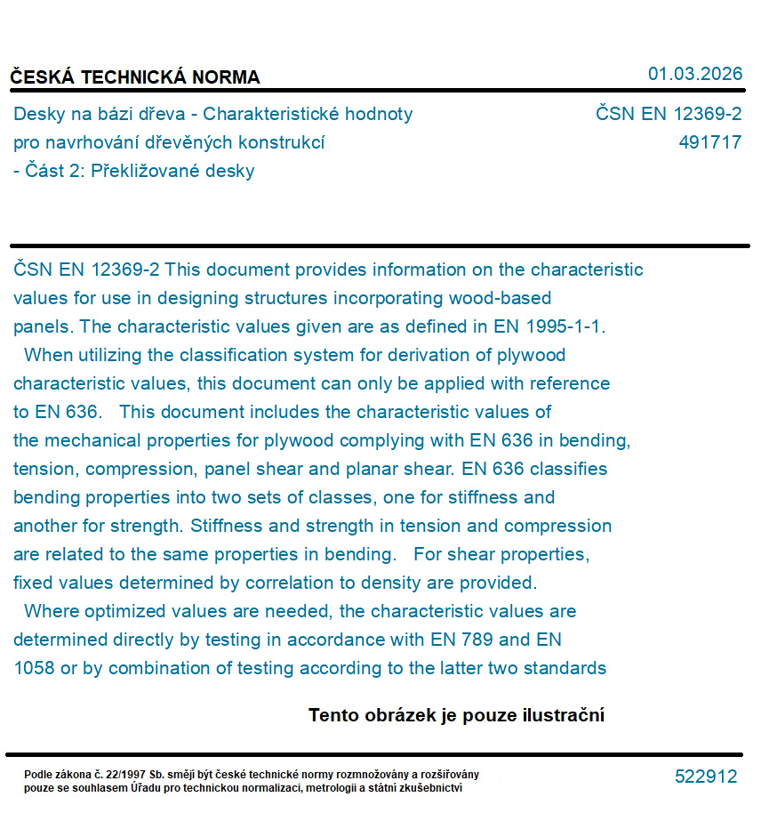 This document provides information on the characteristic values for use in designing structures incorporating wood-based panels. The characteristic values given are as defined in EN 1995-1-1. When utilizing the classification system for derivation of plywood characteristic values, this document can only be applied with reference to EN 636. This document includes the characteristic values of the mechanical properties for plywood complying with EN 636 in bending, tension, compression, panel shear and planar shear. EN 636 classifies bending properties into two sets of classes, one for stiffness and another for strength. Stiffness and strength in tension and compression are related to the same properties in bending. For shear properties, fixed values determined by correlation to density are provided. Where optimized values are needed, the characteristic values are determined directly by testing in accordance with EN 789 and EN 1058 or by combination of testing according to the latter two standards and calculation according to EN 14272. This document applies to panels complying with the three following conditions: - 5 layers or more and 6 mm overall thickness and more; - the ratio of the cumulative thickness of veneers in alternate directions does not exceed 2.5; - wood species with a mean density greater than 350 kg/m3 and not exceeding 750 kg/m3.