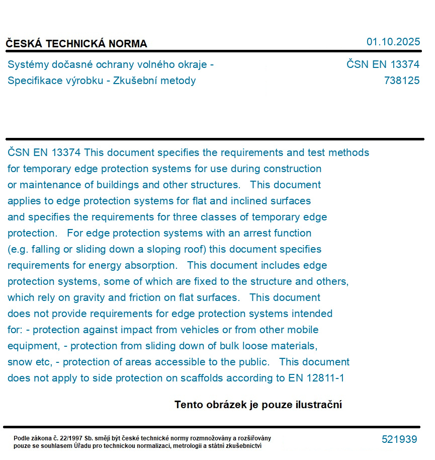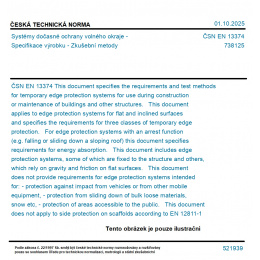 This document specifies the requirements and test methods for temporary edge protection systems for use during construction or maintenance of buildings and other structures. This document applies to edge protection systems for flat and inclined surfaces and specifies the requirements for three classes of temporary edge protection. For edge protection systems with an arrest function (e.g. falling or sliding down a sloping roof) this document specifies requirements for energy absorption. This document includes edge protection systems, some of which are fixed to the structure and others, which rely on gravity and friction on flat surfaces. This document does not provide requirements for edge protection systems intended for: - protection against impact from vehicles or from other mobile equipment, - protection from sliding down of bulk loose materials, snow etc, - protection of areas accessible to the public. This document does not apply to side protection on scaffolds according to EN 12811-1 and EN 1004-1. NOTE - This does not prevent these systems to be used on temporary structures.