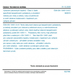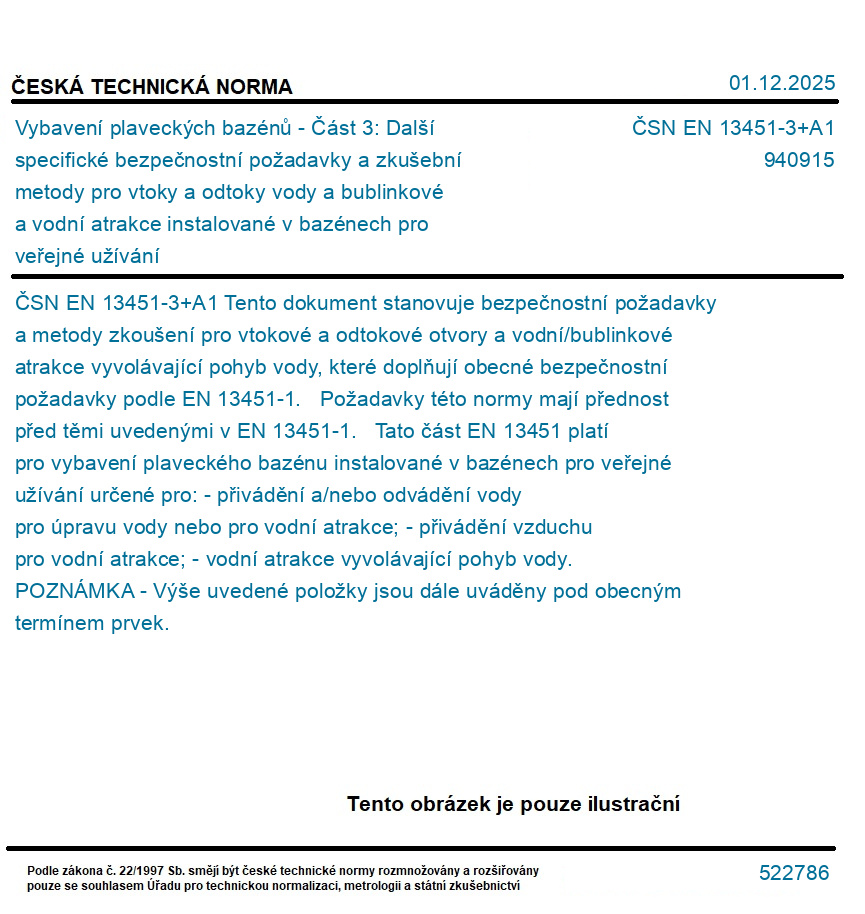 >ČSN EN 13451-3+A1 - Vybavení plaveckých bazénů - Část 3: Další specifické bezpečnostní požadavky a zkušební metody pro vtoky a odtoky vody a bublinkové a vodní atrakce instalované v bazénech pro veřejné užívání