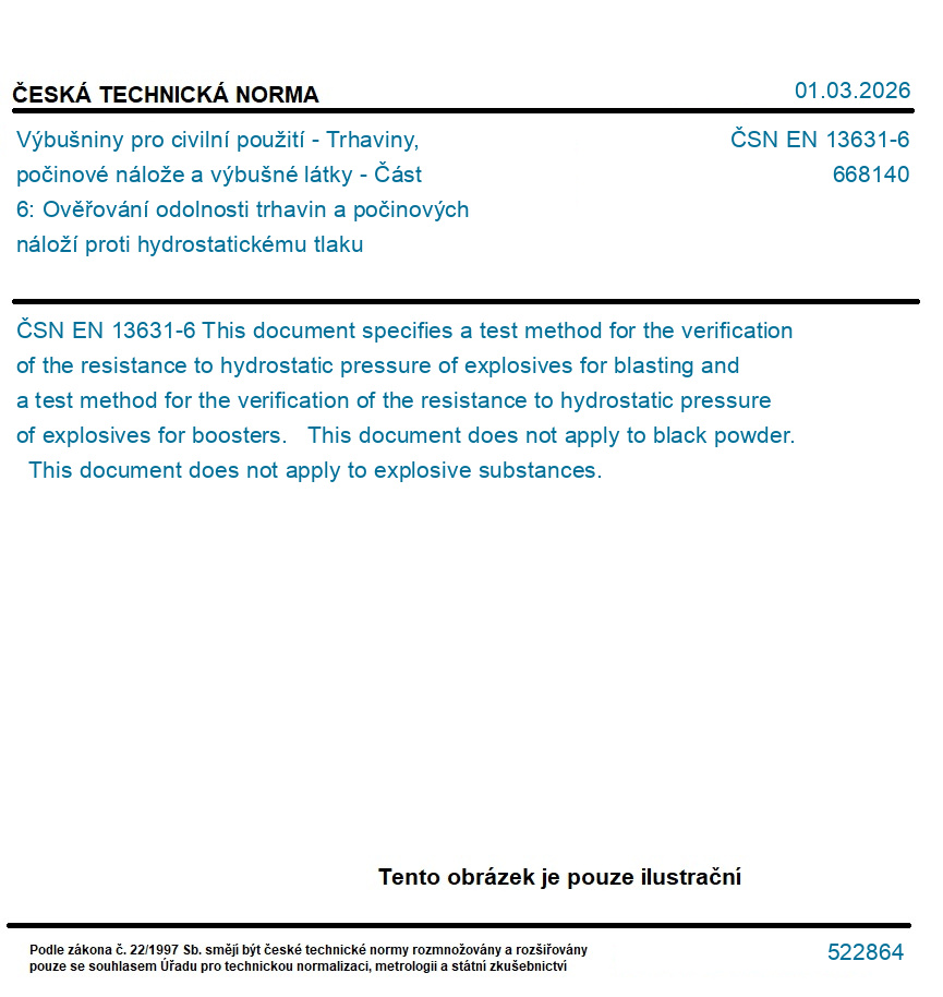 Výbušniny pro civilní použití - Trhaviny, počinové nálože a výbušné látky - Část 6: Ověřování odolnosti trhavin a počinových náloží proti hydrostatickému tlaku