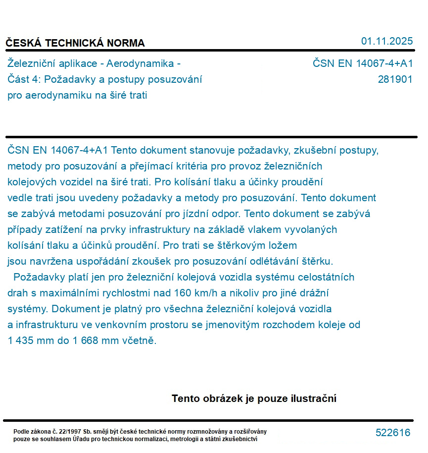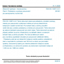 Tento dokument stanovuje požadavky, zkušební postupy, metody pro posuzování a přejímací kritéria pro provoz železničních kolejových vozidel na širé trati. Pro kolísání tlaku a účinky proudění vedle trati jsou uvedeny požadavky a metody pro posuzování. Tento dokument se zabývá metodami posuzování pro jízdní odpor. Tento dokument se zabývá případy zatížení na prvky infrastruktury na základě vlakem vyvolaných kolísání tlaku a účinků proudění. Pro trati se štěrkovým ložem jsou navržena uspořádání zkoušek pro posuzování odlétávání štěrku. Požadavky platí jen pro železniční kolejová vozidla systému celostátních drah s maximálními rychlostmi nad 160 km/h a nikoliv pro jiné drážní systémy. Dokument je platný pro všechna železniční kolejová vozidla a infrastrukturu ve venkovním prostoru se jmenovitým rozchodem koleje od 1 435 mm do 1 668 mm včetně.
