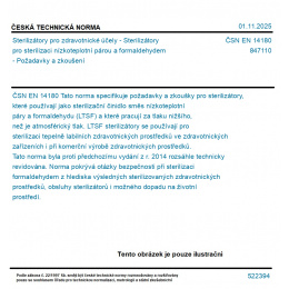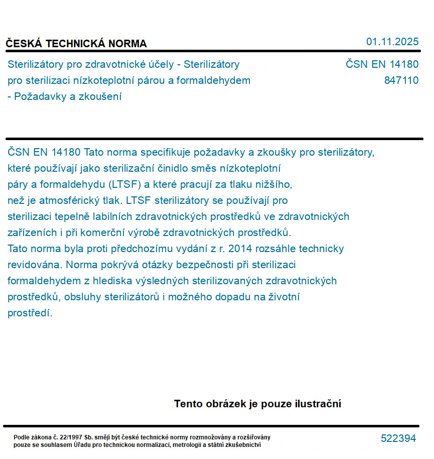 Tato norma specifikuje požadavky a zkoušky pro sterilizátory, které používají jako sterilizační činidlo směs nízkoteplotní páry a formaldehydu (LTSF) a které pracují za tlaku nižšího, než je atmosférický tlak. LTSF sterilizátory se používají pro sterilizaci tepelně labilních zdravotnických prostředků ve zdravotnických zařízeních i při komerční výrobě zdravotnických prostředků. Tato norma byla proti předchozímu vydání z r. 2014 rozsáhle technicky revidována. Norma pokrývá otázky bezpečnosti při sterilizaci formaldehydem z hlediska výsledných sterilizovaných zdravotnických prostředků, obsluhy sterilizátorů i možného dopadu na životní prostředí.