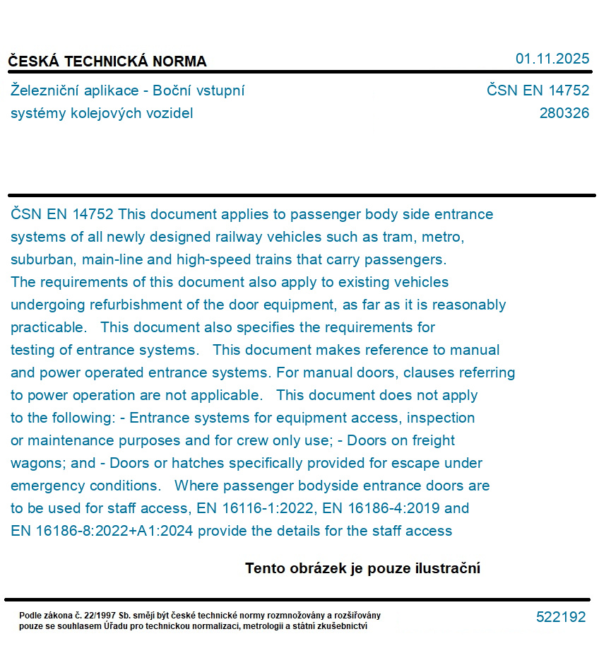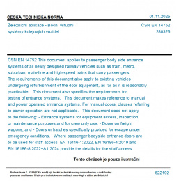 This document applies to passenger body side entrance systems of all newly designed railway vehicles such as tram, metro, suburban, main-line and high-speed trains that carry passengers. The requirements of this document also apply to existing vehicles undergoing refurbishment of the door equipment, as far as it is reasonably practicable. This document also specifies the requirements for testing of entrance systems. This document makes reference to manual and power operated entrance systems. For manual doors, clauses referring to power operation are not applicable. This document does not apply to the following: - Entrance systems for equipment access, inspection or maintenance purposes and for crew only use; - Doors on freight wagons; and - Doors or hatches specifically provided for escape under emergency conditions. Where passenger bodyside entrance doors are to be used for staff access, EN 16116-1:2022, EN 16186-4:2019 and EN 16186-8:2022+A1:2024 provide the details for the staff access requirements.