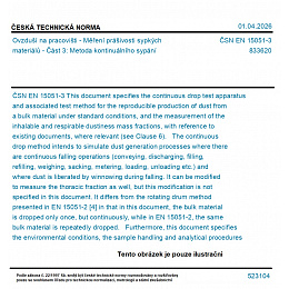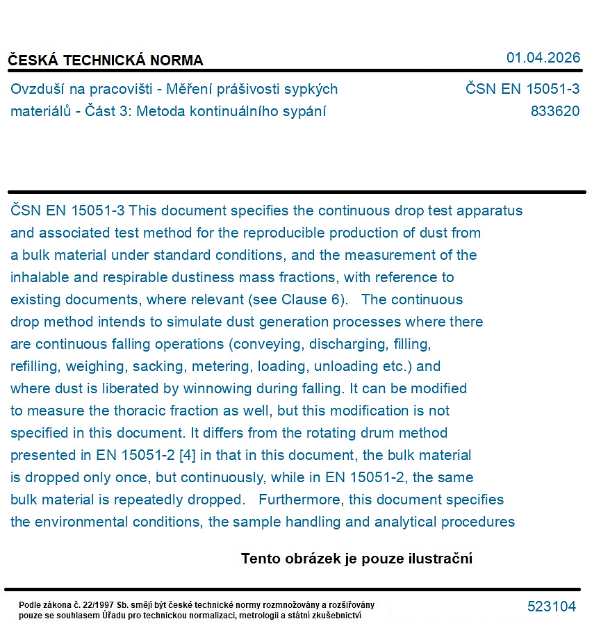 This document specifies the continuous drop test apparatus and associated test method for the reproducible production of dust from a bulk material under standard conditions, and the measurement of the inhalable and respirable dustiness mass fractions, with reference to existing documents, where relevant (see Clause 6). The continuous drop method intends to simulate dust generation processes where there are continuous falling operations (conveying, discharging, filling, refilling, weighing, sacking, metering, loading, unloading etc.) and where dust is liberated by winnowing during falling. It can be modified to measure the thoracic fraction as well, but this modification is not specified in this document. It differs from the rotating drum method presented in EN 15051-2 [4] in that in this document, the bulk material is dropped only once, but continuously, while in EN 15051-2, the same bulk material is repeatedly dropped. Furthermore, this document specifies the environmental conditions, the sample handling and analytical procedures and the method of calculating and presenting the results. A categorization scheme for dustiness is specified, to provide a standardized way to express and communicate the results to users of the bulk materials. This document is applicable to powdered, granular or pelletised bulk materials. This document does not apply to test the dust released when solid bulk materials are mechanically treated (e.g. cut, crushed).