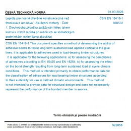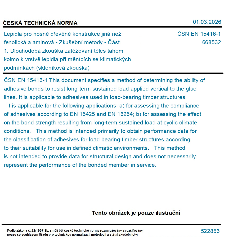 Lepidla pro nosné dřevěné konstrukce jiná než fenolická a aminová - Zkušební metody - Část 1: Dlouhodobá zkouška zatěžování těles tahem kolmo k vrstvě lepidla při měnících se klimatických podmínkách (skleníková zkouška)