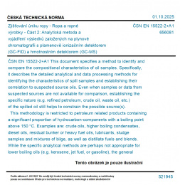 This document specifies a method to identify and compare the compositional characteristics of oil samples. Specifically, it describes the detailed analytical and data processing methods for identifying the characteristics of spill samples and establishing their correlation to suspected source oils. Even when samples or data from suspected sources are not available for comparison, establishing the specific nature (e.g. refined petroleum, crude oil, waste oil, etc.) of the spilled oil still helps to constrain the possible source(s). This methodology is restricted to petroleum related products containing a significant proportion of hydrocarbon-components with a boiling point above 150 °C. Examples are: crude oils, higher boiling condensates, diesel oils, residual bunker or heavy fuel oils, lubricants, sludge samples and mixtures of bilge, as well as distillate fuels and blends. While the specific analytical methods are perhaps not appropriate for lower boiling oils (e.g. kerosene, jet fuel, or gasoline), the general concepts described in this methodology, i.e. statistical comparison of weathering-resistant diagnostic ratios, are applicable in spills involving these kinds of oils. Paraffin products (e.g. waxes, etc.) are outside the scope of this method because too many compounds are removed during the production process [37] to correctly distinguish them from each other. However, the method can be used to identify the type of product involved. Although not directly intended for identifying oil recovered from groundwater, vegetation, wildlife/tissues, soil, or sediment matrices, they are not precluded. However, caution is needed as extractable compounds can be present in these matrices that alter and/or contribute additional compounds compared to the source sample. If unrecognized, the contribution from the matrix can lead to false "non-matches". It is therefore advisable to analyse background sample(s) of the matrix that appear unoiled. When analysing "non-oil" matrices (e.g. contaminated feathers, plants, rocks, sand) additional sample preparation (e.g. clean-up) is often required prior to analysis and the extent to which the matrix affects the correlation achieved is to be considered. Whether the method is applicable for a specific matrix depends upon the oil concentration compared to the "matrix concentration". In matrices containing high concentrations of oil, a positive match can still be concluded. In matrices containing lower concentrations of oil, a false "non-match" or an "inconclusive match" can result from matrix effects. Evaluation of possible matrix effects is beyond the scope of this document.