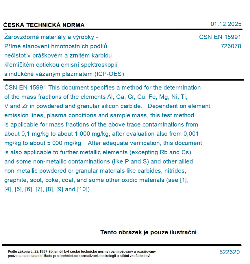Žárovzdorné materiály a výrobky - Přímé stanovení hmotnostních podílů nečistot v práškovém a zrnitém karbidu křemičitém optickou emisní spektroskopií s indukčně vázaným plazmatem (ICP-OES) a s elektrotermickým odpařením (ETV)