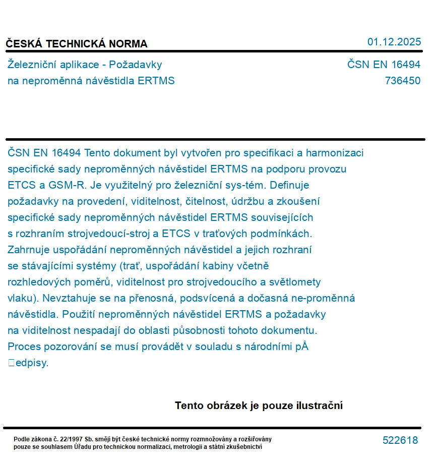 Tento dokument byl vytvořen pro specifikaci a harmonizaci specifické sady neproměnných návěstidel ERTMS na podporu provozu ETCS a GSM-R. Je využitelný pro železniční sys-tém. Definuje požadavky na provedení, viditelnost, čitelnost, údržbu a zkoušení specifické sady neproměnných návěstidel ERTMS souvisejících s rozhraním strojvedoucí-stroj a ETCS v traťových podmínkách. Zahrnuje uspořádání neproměnných návěstidel a jejich rozhraní se stávajícími systémy (trať, uspořádání kabiny včetně rozhledových poměrů, viditelnost pro strojvedoucího a světlomety vlaku). Nevztahuje se na přenosná, podsvícená a dočasná ne-proměnná návěstidla. Použití neproměnných návěstidel ERTMS a požadavky na viditelnost nespadají do oblasti působnosti tohoto dokumentu. Proces pozorování se musí provádět v souladu s národními předpisy.
