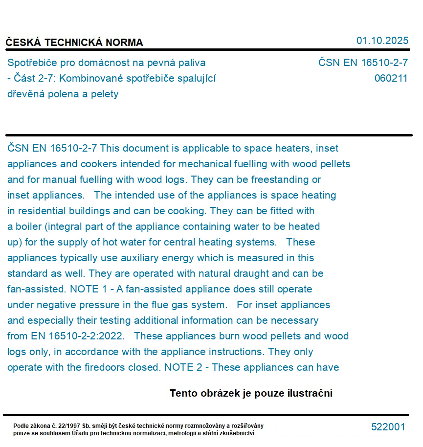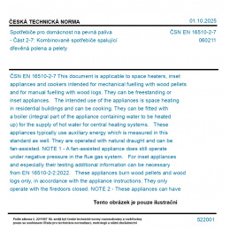 This document is applicable to space heaters, inset appliances and cookers intended for mechanical fuelling with wood pellets and for manual fuelling with wood logs. They can be freestanding or inset appliances. The intended use of the appliances is space heating in residential buildings and can be cooking. They can be fitted with a boiler (integral part of the appliance containing water to be heated up) for the supply of hot water for central heating systems. These appliances typically use auxiliary energy which is measured in this standard as well. They are operated with natural draught and can be fan-assisted. NOTE 1 - A fan-assisted appliance does still operate under negative pressure in the flue gas system. For inset appliances and especially their testing additional information can be necessary from EN 16510-2-2:2022. These appliances burn wood pellets and wood logs only, in accordance with the appliance instructions. They only operate with the firedoors closed. NOTE 2 - These appliances can have an integral fuel hopper or be combined with an external fuel hopper. These appliances can be fitted with a single or double combustion chamber having a single flue gas outlet. This document specifies procedures for assessment and verification of constancy of performance (AVCP) of characteristics of combination appliances fired by wood logs and pellets. This document is not applicable to appliances: - with boiler intended for water systems having water temperatures above 110°C and 3 bar and for sanitary hot water, - intended to be used with a pure horizontal exhaust (through the building wall), - with flue gas condensation in the appliance, - switching on / off for part load operation, - with simultaneous wood and pellet operation with a single flue gas outlet, - with non-automatic pellet loading, - with single combustion chamber and double flue gas outlet, - continuous burning appliances. For clarity, all test methods are addressed in Annex A.