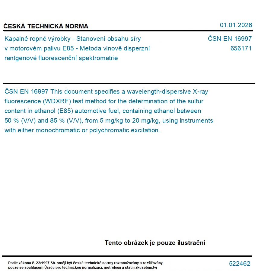 Kapalné ropné výrobky - Stanovení obsahu síry v motorovém palivu E85 - Metoda vlnově disperzní rentgenové fluorescenční spektrometrie