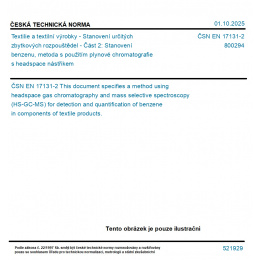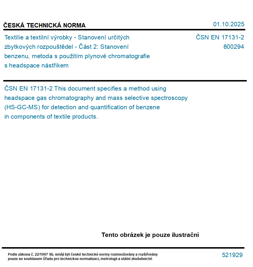 Textilie a textilní výrobky - Stanovení určitých zbytkových rozpouštědel - Část 2: Stanovení benzenu, metoda s použitím plynové chromatografie s headspace nástřikem
