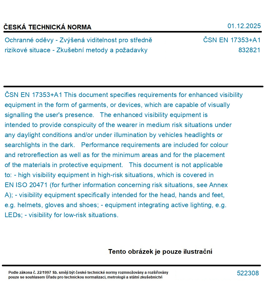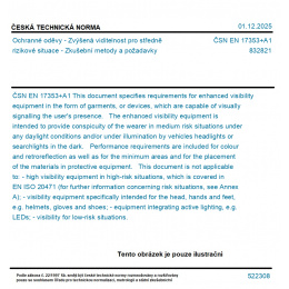 >ČSN EN 17353+A1 - Ochranné oděvy - Zvýšená viditelnost pro středně rizikové situace - Zkušební metody a požadavky