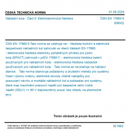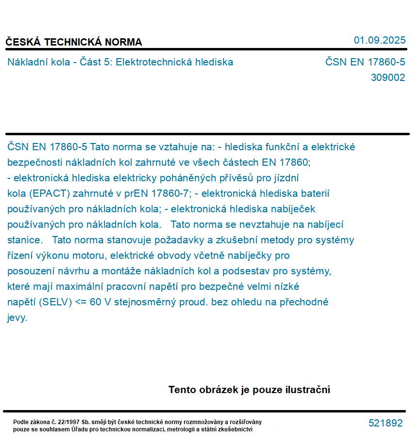 Tato norma se vztahuje na: - hlediska funkční a elektrické bezpečnosti nákladních kol zahrnuté ve všech částech EN 17860; - elektronická hlediska elektricky poháněných přívěsů pro jízdní kola (EPACT) zahrnuté v prEN 17860-7; - elektronická hlediska baterií používaných pro nákladních kola; - elektronická hlediska nabíječek používaných pro nákladních kola. Tato norma se nevztahuje na nabíjecí stanice. Tato norma stanovuje požadavky a zkušební metody pro systémy řízení výkonu motoru, elektrické obvody včetně nabíječky pro posouzení návrhu a montáže nákladních kol a podsestav pro systémy, které mají maximální pracovní napětí pro bezpečné velmi nízké napětí (SELV) <= 60 V stejnosměrný proud. bez ohledu na přechodné jevy.
