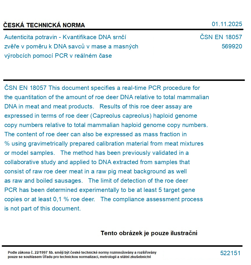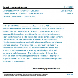 >ČSN EN 18057 - Autenticita potravin - Kvantifikace DNA srnčí zvěře v poměru k DNA savců v mase a masných výrobcích pomocí PCR v reálném čase