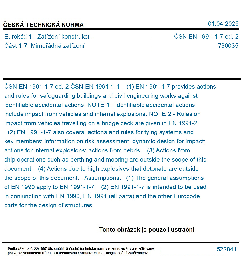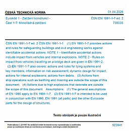 ČSN EN 1991-1-1 (1) EN 1991-1-7 provides actions and rules for safeguarding buildings and civil engineering works against identifiable accidental actions. NOTE 1 - Identifiable accidental actions include impact from vehicles and internal explosions. NOTE 2 - Rules on impact from vehicles travelling on a bridge deck are given in EN 1991-2. (2) EN 1991-1-7 also covers: actions and rules for tying systems and key members; information on risk assessment; dynamic design for impact; actions for internal explosions; actions from debris. (3) Actions from ship operations such as berthing and mooring are outside the scope of this document. (4) Actions due to high explosives that detonate are outside the scope of this document. Assumptions: (1) The general assumptions of EN 1990 apply to EN 1991-1-7. (2) EN 1991-1-7 is intended to be used in conjunction with EN 1990, EN 1991 (all parts) and the other Eurocode parts for the design of structures.