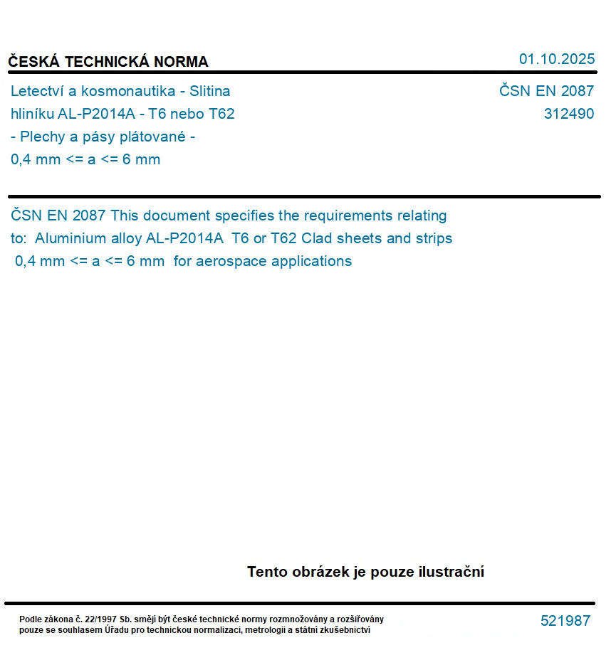 Letectví a kosmonautika - Slitina hliníku AL-P2014A - T6 nebo T62 - Plechy a pásy plátované - 0,4 mm <= a <= 6 mm