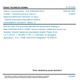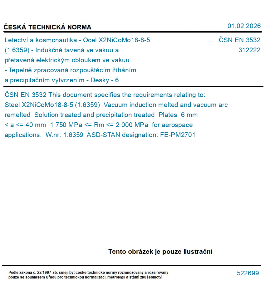 Letectví a kosmonautika - Ocel X2NiCoMo18-8-5 (1.6359) - Indukčně tavená ve vakuu a přetavená elektrickým obloukem ve vakuu - Tepelně zpracovaná rozpouštěcím žíháním a precipitačním vytvrzením - Desky - 6 mm < a <= 40 mm - 1 750 MPa <= Rm <= 2 000 MPa
