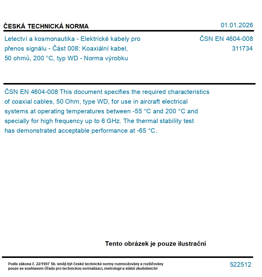 Letectví a kosmonautika - Elektrické kabely pro přenos signálu - Část 008: Koaxiální kabel, 50 ohmů, 200 °C, typ WD - Norma výrobku