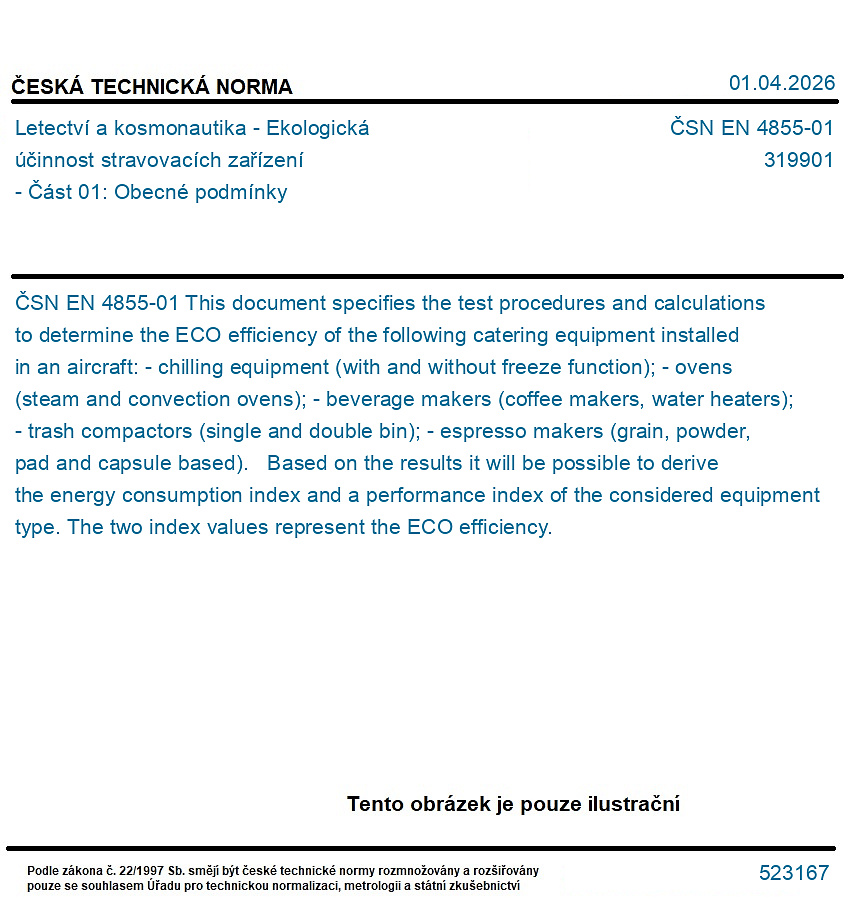 This document specifies the test procedures and calculations to determine the ECO efficiency of the following catering equipment installed in an aircraft: - chilling equipment (with and without freeze function); - ovens (steam and convection ovens); - beverage makers (coffee makers, water heaters); - trash compactors (single and double bin); - espresso makers (grain, powder, pad and capsule based). Based on the results it will be possible to derive the energy consumption index and a performance index of the considered equipment type. The two index values represent the ECO efficiency.
