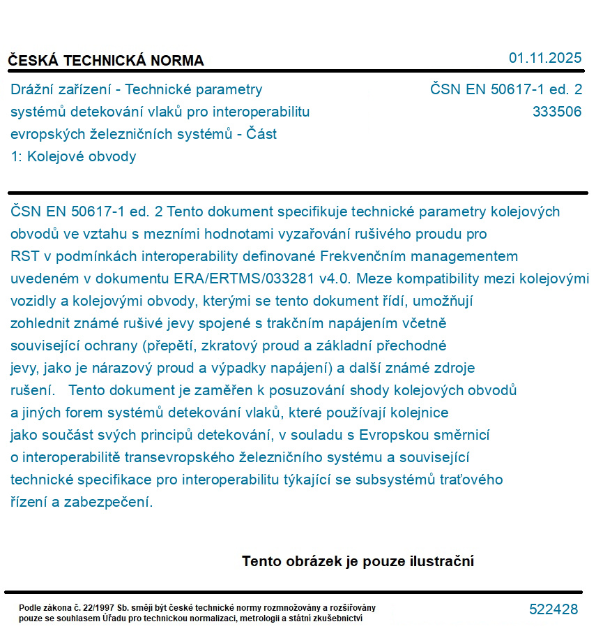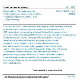 Tento dokument specifikuje technické parametry kolejových obvodů ve vztahu s mezními hodnotami vyzařování rušivého proudu pro RST v podmínkách interoperability definované Frekvenčním managementem uvedeném v dokumentu ERA/ERTMS/033281 v4.0. Meze kompatibility mezi kolejovými vozidly a kolejovými obvody, kterými se tento dokument řídí, umožňují zohlednit známé rušivé jevy spojené s trakčním napájením včetně související ochrany (přepětí, zkratový proud a základní přechodné jevy, jako je nárazový proud a výpadky napájení) a další známé zdroje rušení. Tento dokument je zaměřen k posuzování shody kolejových obvodů a jiných forem systémů detekování vlaků, které používají kolejnice jako součást svých principů detekování, v souladu s Evropskou směrnicí o interoperabilitě transevropského železničního systému a související technické specifikace pro interoperabilitu týkající se subsystémů traťového řízení a zabezpečení.