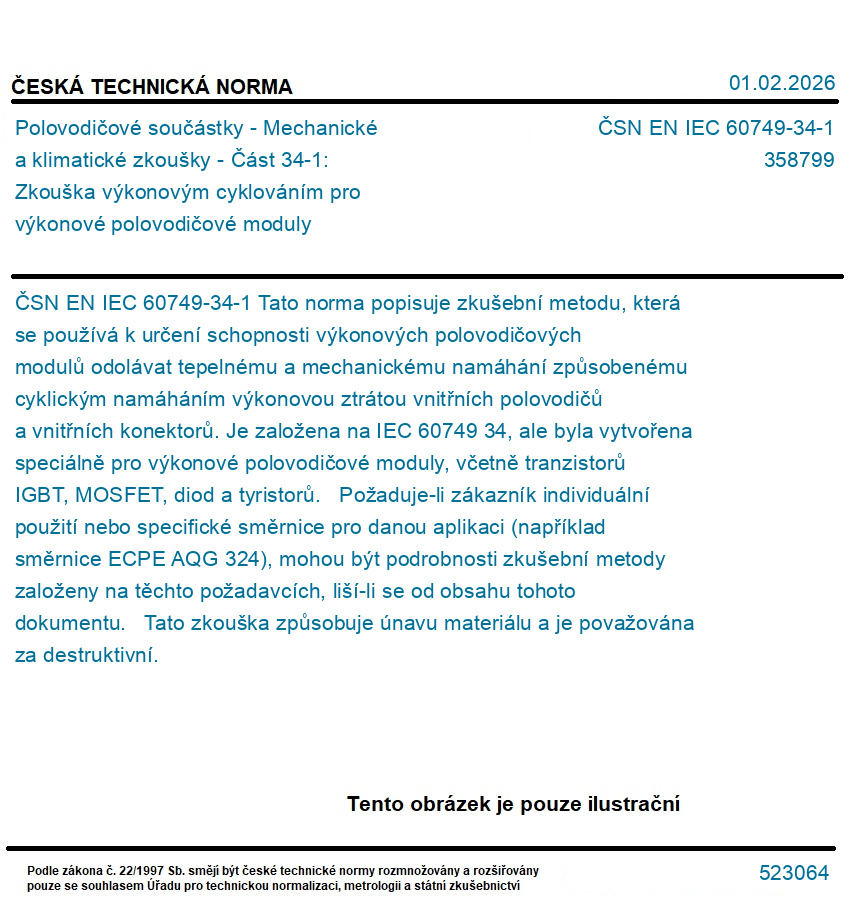 Tato norma popisuje zkušební metodu, která se používá k určení schopnosti výkonových polovodičových modulů odolávat tepelnému a mechanickému namáhání způsobenému cyklickým namáháním výkonovou ztrátou vnitřních polovodičů a vnitřních konektorů. Je založena na IEC 60749 34, ale byla vytvořena speciálně pro výkonové polovodičové moduly, včetně tranzistorů IGBT, MOSFET, diod a tyristorů. Požaduje-li zákazník individuální použití nebo specifické směrnice pro danou aplikaci (například směrnice ECPE AQG 324), mohou být podrobnosti zkušební metody založeny na těchto požadavcích, liší-li se od obsahu tohoto dokumentu. Tato zkouška způsobuje únavu materiálu a je považována za destruktivní.