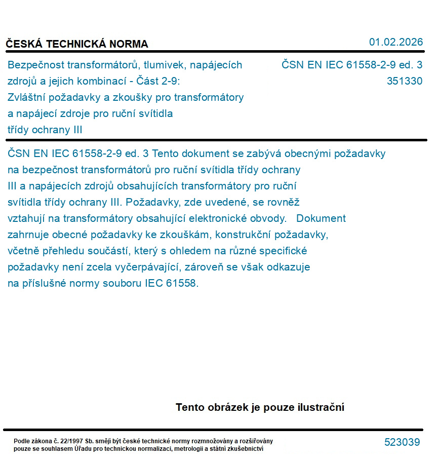 | Označení normy: | ČSN EN IEC 61558-2-9 ed. 3 |