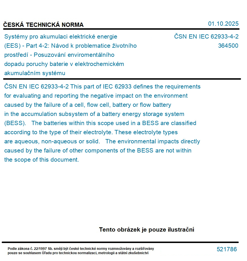 Systémy pro akumulaci elektrické energie (EES) - Part 4-2: Návod k problematice životního prostředí - Posuzování enviromentálního dopadu poruchy baterie v elektrochemickém akumulačním systému