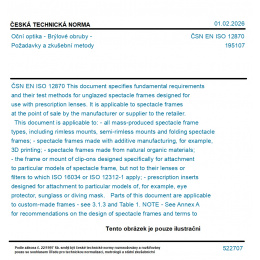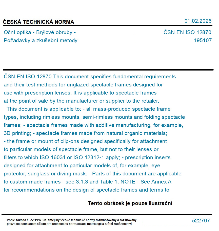 This document specifies fundamental requirements and their test methods for unglazed spectacle frames designed for use with prescription lenses. It is applicable to spectacle frames at the point of sale by the manufacturer or supplier to the retailer. This document is applicable to: - all mass-produced spectacle frame types, including rimless mounts, semi-rimless mounts and folding spectacle frames; - spectacle frames made with additive manufacturing, for example, 3D printing; - spectacle frames made from natural organic materials; - the frame or mount of clip-ons designed specifically for attachment to particular models of spectacle frame, but not to their lenses or filters to which ISO 16034 or ISO 12312-1 apply; - prescription inserts designed for attachment to particular models of, for example, eye protector, sunglass or diving mask. Parts of this document are applicable to custom-made frames - see 3.1.3 and Table 1. NOTE - See Annex A for recommendations on the design of spectacle frames and terms to be used when describing metal frames. This document is not applicable to spectacle frames used in eye protection, where ISO 16321-1 applies, or to sunglasses with afocal filters, where ISO 12312-1 applies.