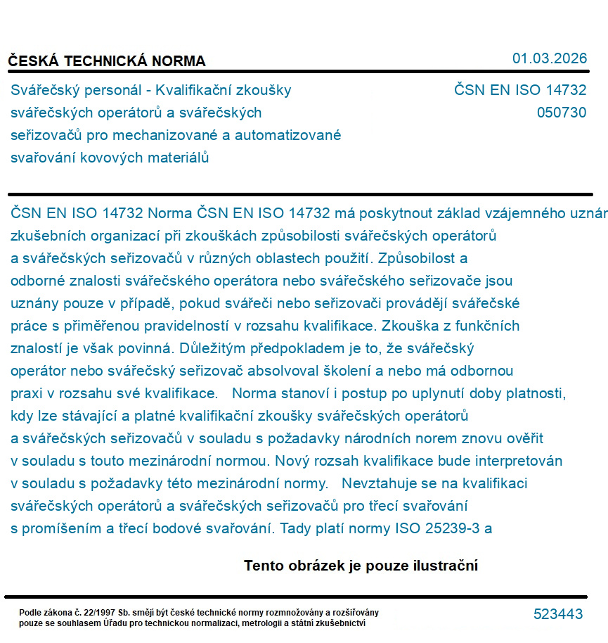 Norma ČSN EN ISO 14732 má poskytnout základ vzájemného uznání zkušebních organizací při zkouškách způsobilosti svářečských operátorů a svářečských seřizovačů v různých oblastech použití. Způsobilost a odborné znalosti svářečského operátora nebo svářečského seřizovače jsou uznány pouze v případě, pokud svářeči nebo seřizovači provádějí svářečské práce s přiměřenou pravidelností v rozsahu kvalifikace. Zkouška z funkčních znalostí je však povinná. Důležitým předpokladem je to, že svářečský operátor nebo svářečský seřizovač absolvoval školení a nebo má odbornou praxi v rozsahu své kvalifikace. Norma stanoví i postup po uplynutí doby platnosti, kdy lze stávající a platné kvalifikační zkoušky svářečských operátorů a svářečských seřizovačů v souladu s požadavky národních norem znovu ověřit v souladu s touto mezinárodní normou. Nový rozsah kvalifikace bude interpretován v souladu s požadavky této mezinárodní normy. Nevztahuje se na kvalifikaci svářečských operátorů a svářečských seřizovačů pro třecí svařování s promíšením a třecí bodové svařování. Tady platí normy ISO 25239-3 a ISO 18785-3.