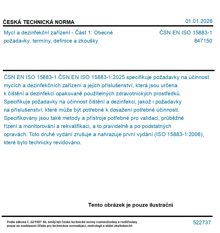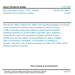 ČSN EN ISO 15883-1:2025 specifikuje požadavky na účinnost mycích a dezinfekčních zařízení a jejich příslušenství, která jsou určena k čištění a dezinfekci opakovaně použitelných zdravotnických prostředků. Specifikuje požadavky na účinnost čištění a dezinfekci, jakož i požadavky na příslušenství, které může být potřebné k dosažení potřebné účinnosti. Specifikovány jsou také metody a přístroje potřebné pro validaci, průběžné řízení a monitorování a rekvalifikaci, a to pravidelně a po podstatných opravách. Toto druhé vydání zrušuje a nahrazuje první vydání (ISO 15883-1:2006), které bylo technicky revidováno.