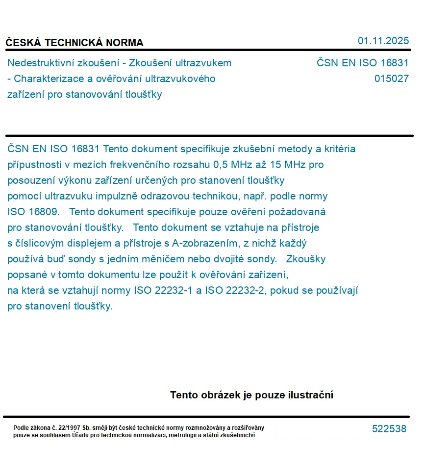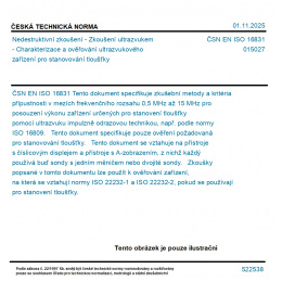 Tento dokument specifikuje zkušební metody a kritéria přípustnosti v mezích frekvenčního rozsahu 0,5 MHz až 15 MHz pro posouzení výkonu zařízení určených pro stanovení tloušťky pomocí ultrazvuku impulzně odrazovou technikou, např. podle normy ISO 16809. Tento dokument specifikuje pouze ověření požadovaná pro stanovování tloušťky. Tento dokument se vztahuje na přístroje s číslicovým displejem a přístroje s A-zobrazením, z nichž každý používá buď sondy s jedním měničem nebo dvojité sondy. Zkoušky popsané v tomto dokumentu lze použít k ověřování zařízení, na která se vztahují normy ISO 22232-1 a ISO 22232-2, pokud se používají pro stanovení tloušťky.