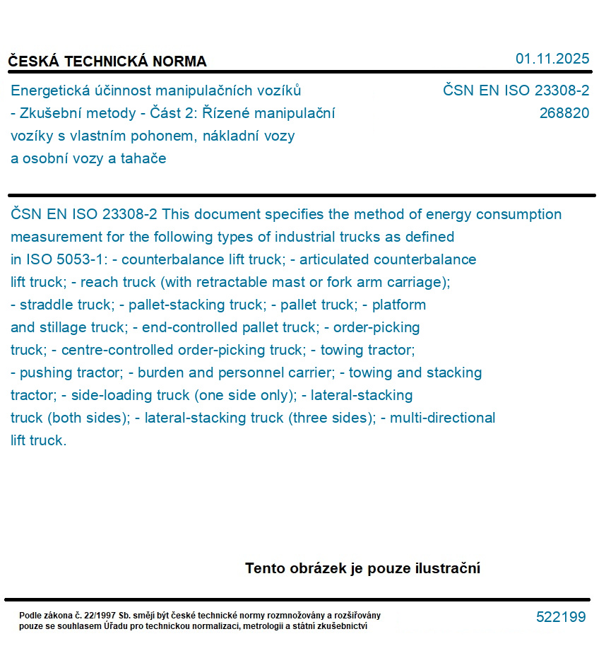 Energetická účinnost manipulačních vozíků - Zkušební metody - Část 2: Řízené manipulační vozíky s vlastním pohonem, nákladní vozy a osobní vozy a tahače