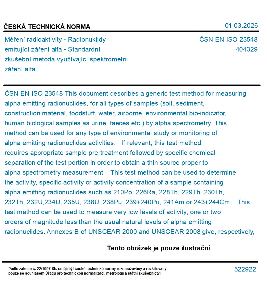 This document describes a generic test method for measuring alpha emitting radionuclides, for all types of samples (soil, sediment, construction material, foodstuff, water, airborne, environmental bio-indicator, human biological samples as urine, faeces etc.) by alpha spectrometry. This method can be used for any type of environmental study or monitoring of alpha emitting radionuclides activities. If relevant, this test method requires appropriate sample pre-treatment followed by specific chemical separation of the test portion in order to obtain a thin source proper to alpha spectrometry measurement. This test method can be used to determine the activity, specific activity or activity concentration of a sample containing alpha emitting radionuclides such as 210Po, 226Ra, 228Th, 229Th, 230Th, 232Th, 232U,234U, 235U, 238U, 238Pu, 239+240Pu, 241Am or 243+244Cm. This test method can be used to measure very low levels of activity, one or two orders of magnitude less than the usual natural levels of alpha emitting radionuclides. Annexes B of UNSCEAR 2000 and UNSCEAR 2008 give, respectively, typical natural activity concentrations for air, foods, drinking waters and, soils and building materials. The detection limit of the test method depends on the amount of the sample material analysed (mass or volume) after concentration, chemical yield, thickness of measurement source and counting time. The quantity of the sample to be collected and analysed depends on the expected activity of the sample and the detection limit to achieve.
