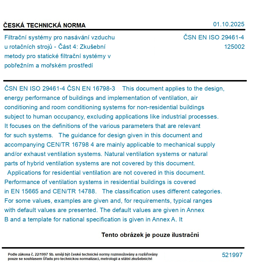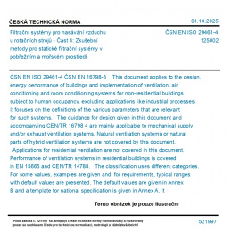ČSN EN 16798-3 This document applies to the design, energy performance of buildings and implementation of ventilation, air conditioning and room conditioning systems for non-residential buildings subject to human occupancy, excluding applications like industrial processes. It focuses on the definitions of the various parameters that are relevant for such systems. The guidance for design given in this document and accompanying CEN/TR 16798 4 are mainly applicable to mechanical supply and/or exhaust ventilation systems. Natural ventilation systems or natural parts of hybrid ventilation systems are not covered by this document. Applications for residential ventilation are not covered in this document. Performance of ventilation systems in residential buildings is covered in EN 15665 and CEN/TR 14788. The classification uses different categories. For some values, examples are given and, for requirements, typical ranges with default values are presented. The default values are given in Annex B and a template for national specification is given in Annex A. It is important that the classification is always appropriate to the type of building and its intended use, and that the basis of the classification is explained if the examples given in this document are not used. NOTE 1 - Different standards can express the categories for the same parameters in a different way, and also the category symbols can be different. Table 1 shows the relative position of this document within the set of EPB standards in the context of the modular structure as set out in EN ISO 52000 1. NOTE 2 - In CEN ISO/TR 52000 2 the same Table can be found, with, for each module, the numbers of the relevant EPB standards and accompanying technical reports that are published or in preparation. NOTE 3 - The modules represent EPB standards, although one EPB standard might cover more than one module and one module might be covered by more than one EPB standard, for instance a simplified and a detailed method respectively. See also Clause 2 and Table A.1 and Table B.1.